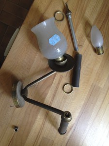 Vi var på lokala loppmarknaden och köpte två lampor till hallväggen. L har rengjort och putsat dem och jag drar om elen inne i dem. En av dem före puts: