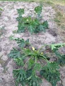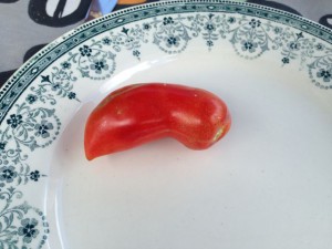 Skördade och åt första tomaten idag. Ska vara plommontomat men är lite deformerad… Mycket god.