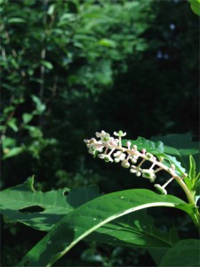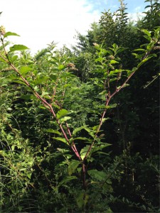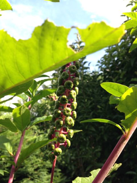 Och denna har jag frågat om förr. Växer fort som ett ogräs. 2 m hög. Lilaaktig stam. Vita små blommor. Som sedan blir lilaaktiga frukter:
