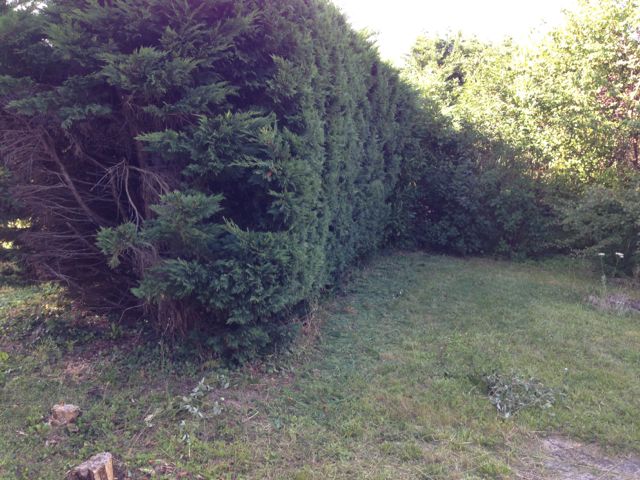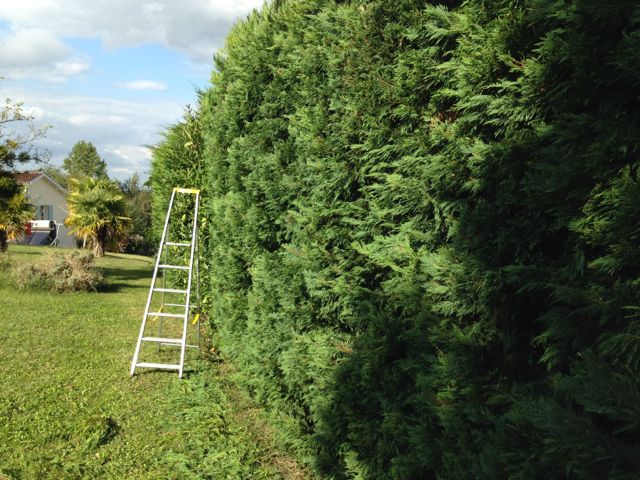 Trädgårdsarbete, börjat klippa tuja med ny elektrisk häcksax.