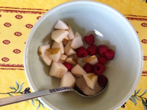 Frukostfrukt igår blev egna päron och egna hallon. Päronen är riktigt goda i år. De andra åren har de aldrig mognat riktigt eller så har vi varit här fel period.