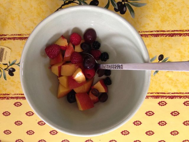 Och i morse tog vi en köpt nektarin men egna hallon, björnbär och vindruvor.