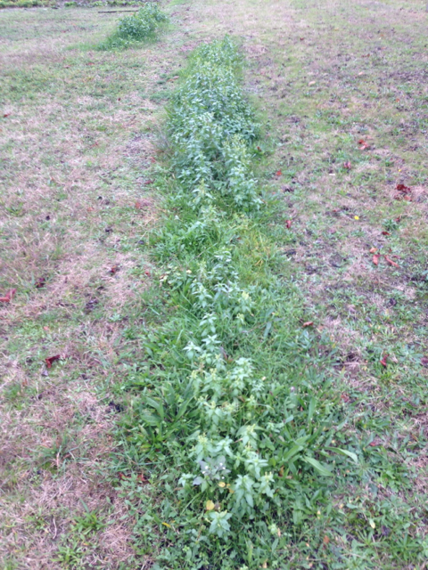Där jag planterade lite nytt gräs i augusti har det växt på bra. Dock med inslag av någon extraväxt…