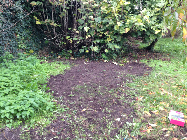 Rensade brännässlor. Regn efter lunchen. Sått gräs där brännässlorna stått: