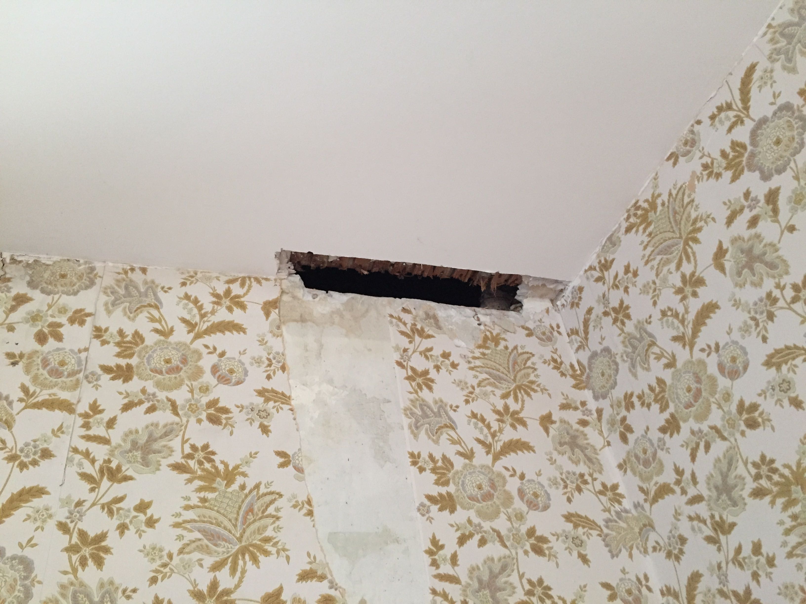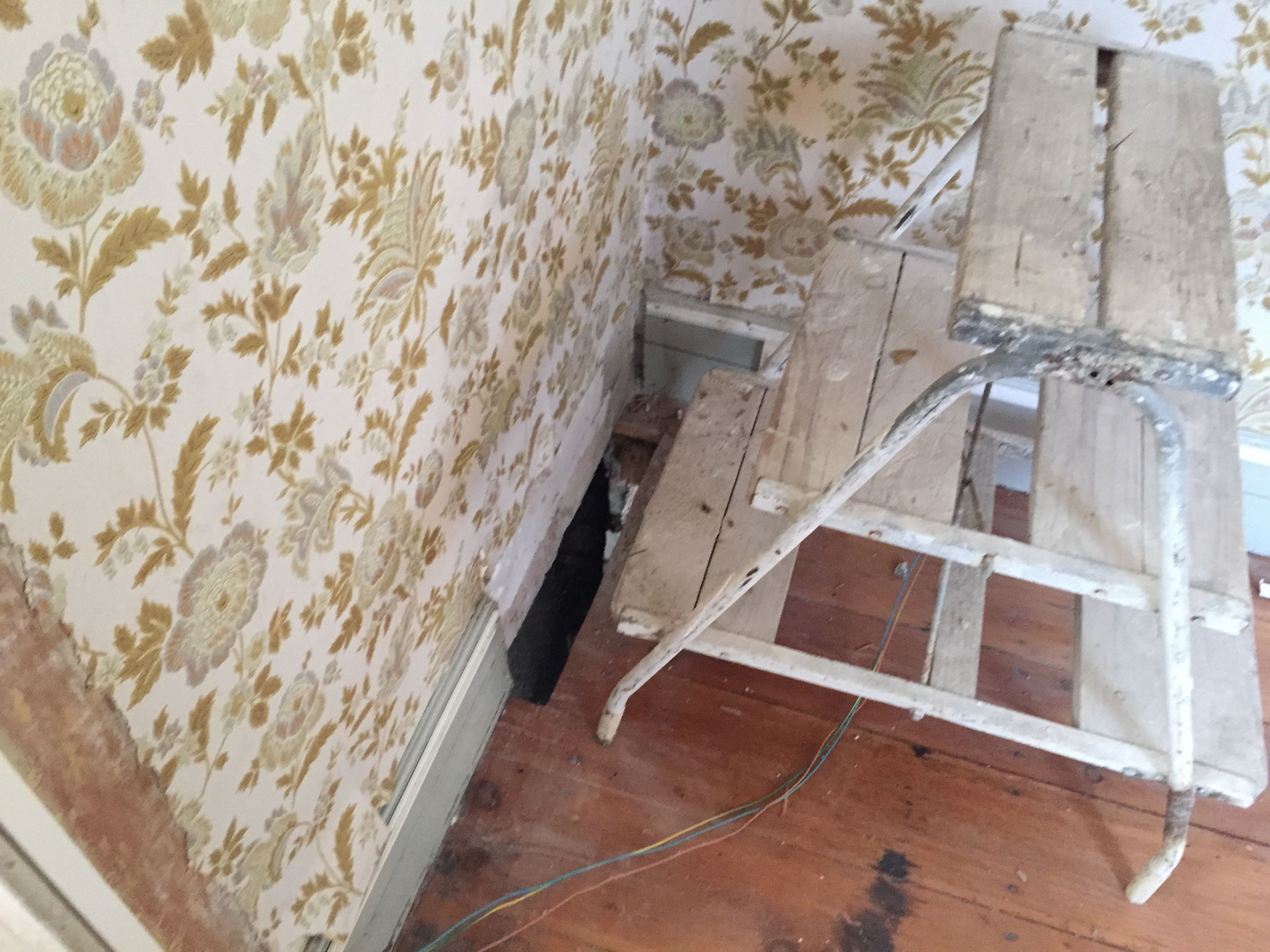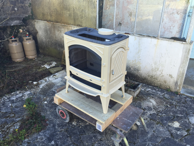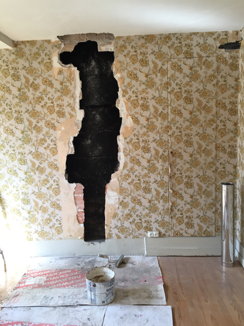 Kaminmannen jobbade på. Huggit upp hela väggen i matrummet nu. Han stöter på många problem som han svär lite över. Tror nästan han ångrat att han åtagit sig jobbet…