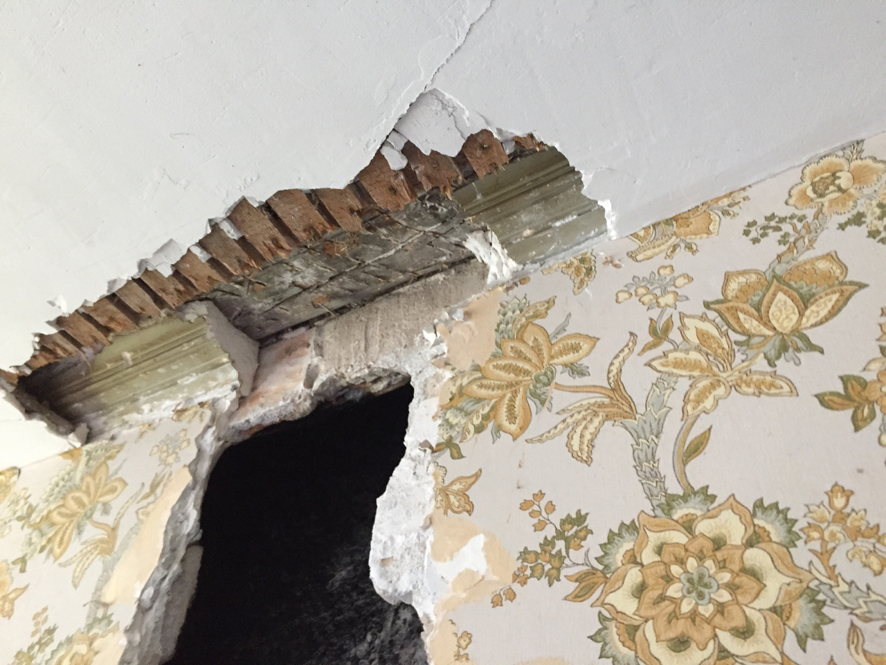 Så här såg det ut uppe vid taket i matrummet. Träbjälken närmast väggen måste urholkas för den får inte ligga mot rökkanalen. Notera den fina grönaktiga listen som finns under gipstaket.