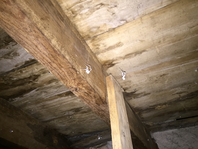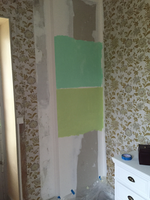 Provmålat i vårt sovrum. Tycker inte någon av dem är riktigt lyckad. Fransmän gillar ju lite skarpare färger så vi försöker anpassa oss till det 🙂