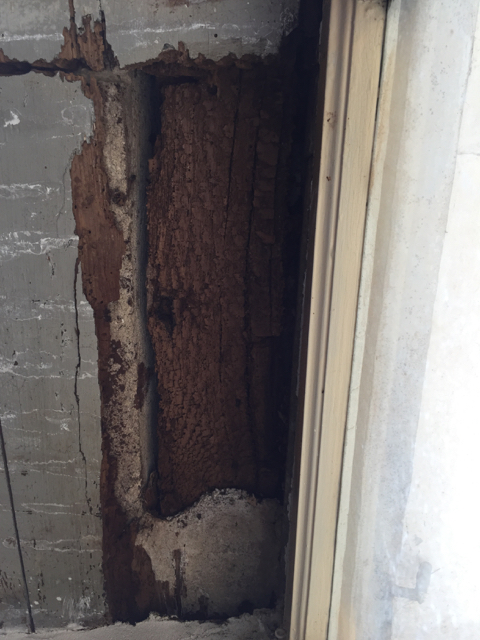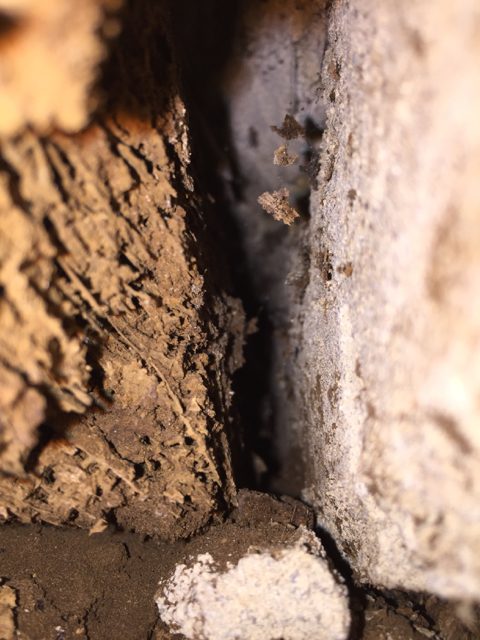 Sten till vänster, murket trä till höger. Sedan verkar man ha lagt ett lager puts under träbjälken förmodligen för att jämna ut? Eller skydda mot fukt? (Det verkar ju inte ha lyckats i sådana fall…)