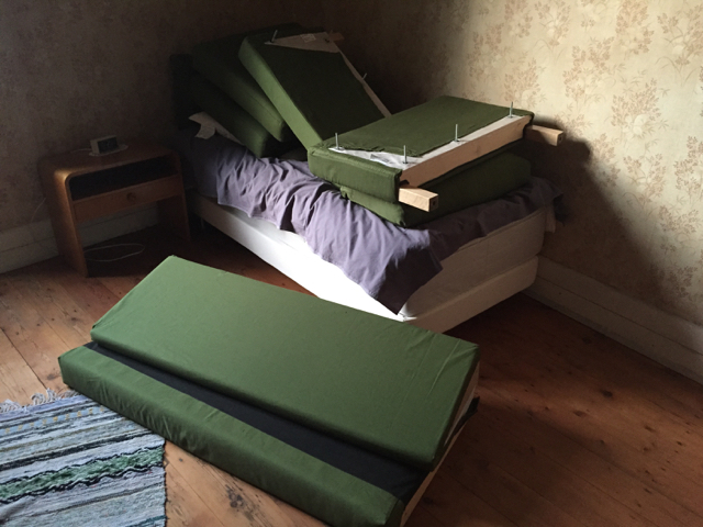 Och så spontanshoppade vi en enkel tillfällig soffa. Egentligen vill vi ha en i skinn men den här får duga tills vidare. Den är i tyg så man får väl täcka över den när man åker här ifrån så att det inte blir allt för mycket spindlar och sådant i den. Soffan var på rea (utställningsex) och redan monterad så vi fick demontera den för att få in den i bilen. 234€. Soffa i delar: