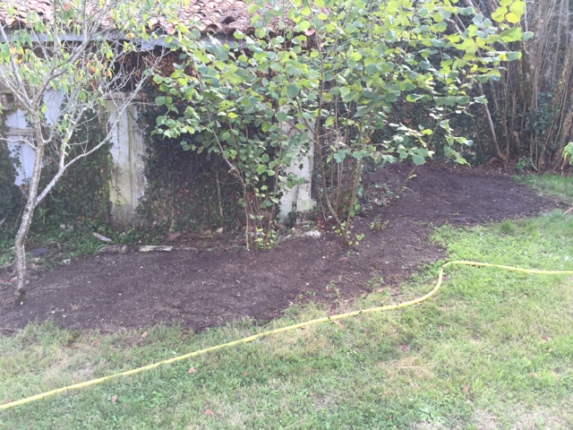 Rensat lite björnbärssnår och påbörjat konvertering från slyigt område till gräsmatta. Tagit jord från Georges gamla gödselhög till höger på bilden. Ska försöka så lite gräs där också.