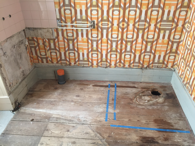 Toastol och ena handfatet borttaget där uppe samt alla gamla vattenledningar till dusch mm. Nytt avlopp och vattenledning där nya toan ska stå. Ställs dit efter att golvet är fixat. Till höger blå markering för dusch.