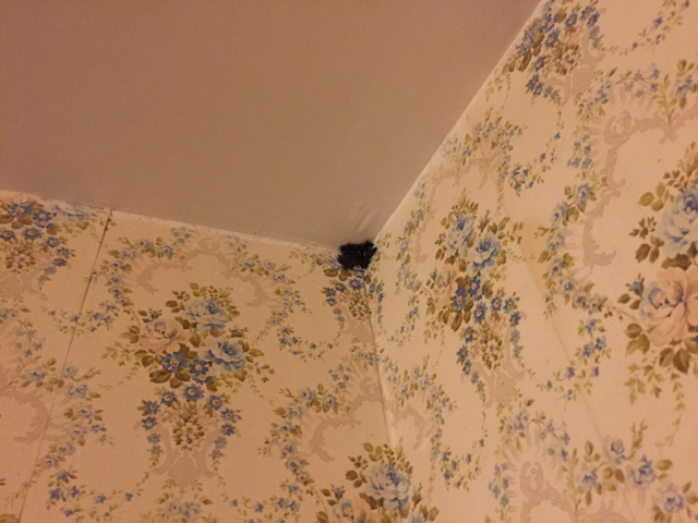 Jag såg inte riktigt vad det var så jag tog först en bild utan blixt och sedan en med blixt. När blixten tändes ”exploderade” fläcken i ett moln av flugor. Så äckligt och skrämmande. De hade kurat ihop sig i hörnet. Sedan köpte vi en spray och har väl snart dödat alla flugor i det rummet. (Ni som sett serien Fortitude vet hur det är när ett rum fylls av flugor 😉 )