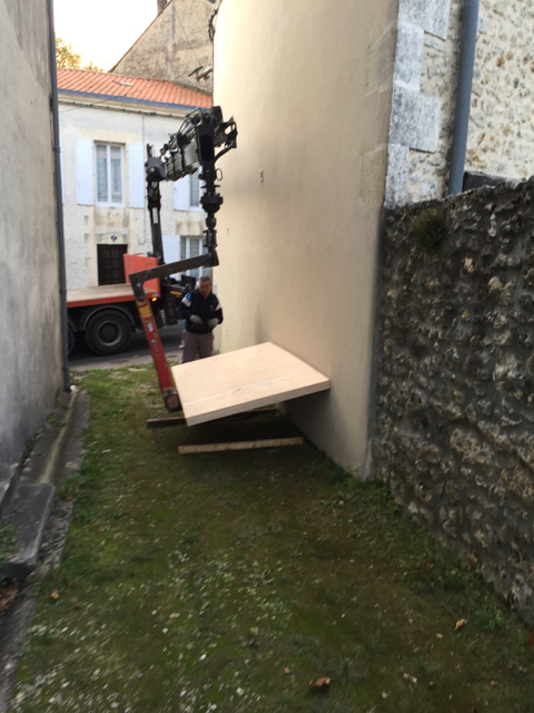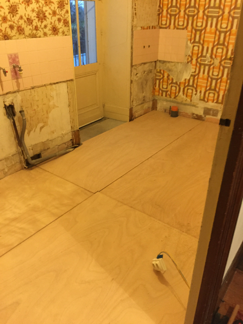 Innan jag började med skivorna skulle jag lyfta bort badrumsdörren. Den går ju inåt i badrummet så den behövde tas bort för att kunna lägga skivorna. Och tror man att det ska gå lätt att lyfta bort en innerdörr så har man inte haft hus i Frankrike 🙂 . Gångjärnen var monterade ”mot varandra” så de s.a.s. låste varandra. Ett gångjärn behövde lyftas av neråt och 2 uppåt. Så det var bara till att skruva bort gångjärnen i stället.