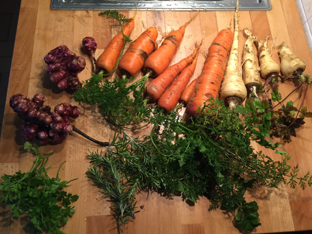 Skördade palsternackor, morötter, jordärtskockor, rosmarin och persilja till middagen. Blir rotfrukter i ugn med palourder (vongole).