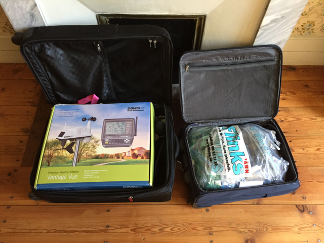 Så här nördig var min packning den här gången. Två väskor fyllda med väderstation och pallbrickor.