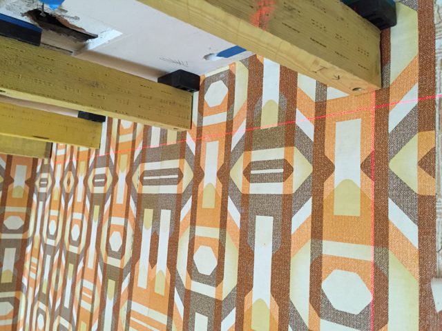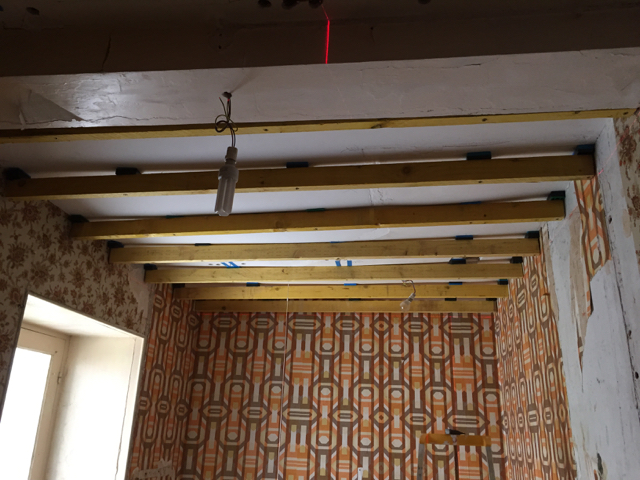 Började lägga in pallbrickor mellan reglarna och taket. Gick väl sådär. Blir lite ostadigt tycker jag. Kanske för liten del av skruven som går in i gamla reglarna. Men har gjort klart ena sidan om stora regeln i taket. Ser ju snett och vint ut men krysslasern säger något annat.