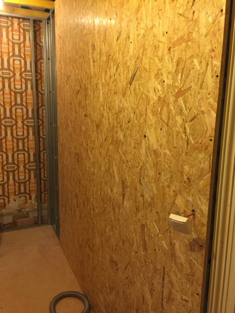 Jag har fortsatt sätta upp skivor på väggen mot trappen. Satte dit extra reglar så regelavståndet nu är 30 cm. Vi funderar ju på att helkakla den väggen.