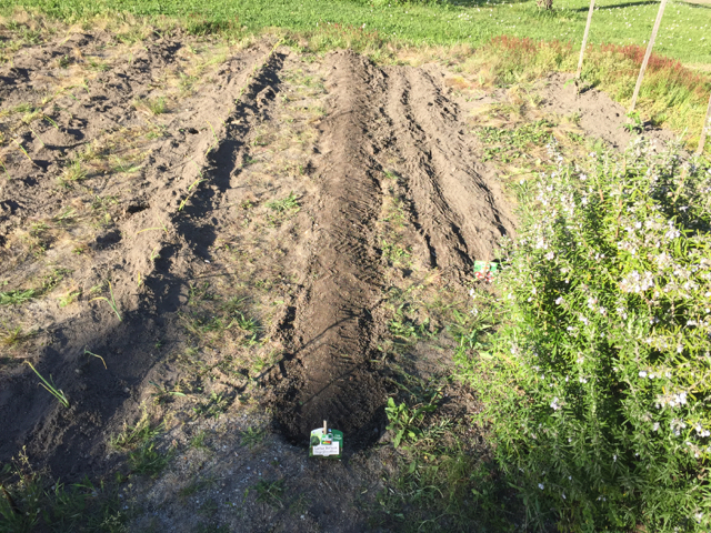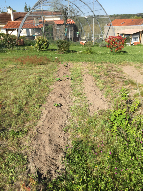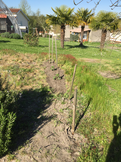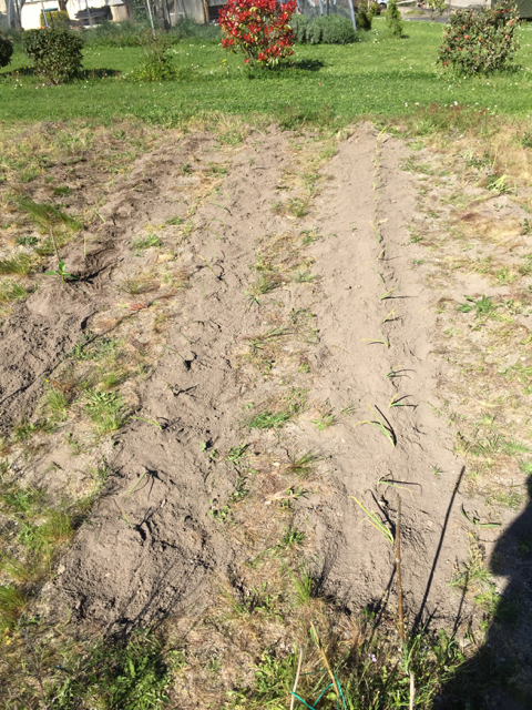 Satt två och en halv rad gul lökplantor och en paprikaplanta. (Klantigt med fotografens skugga, jag vet…)