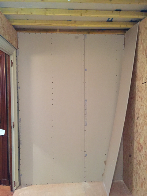 Satte upp gipsskivor på två väggar. Grönblå skivor är fuktsäkra.