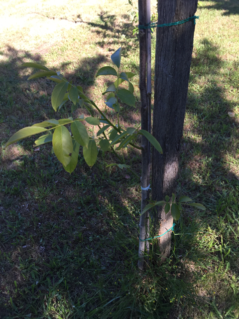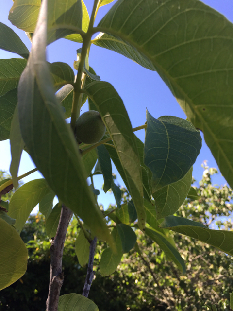 Valnötsträdet har en valnöt. Sidogrenen på stammen kommer jag kapa nu.
