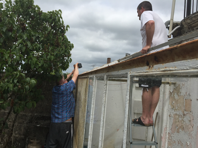 You are here: Home › 2016-06 › 20 juni 2016 20 juni 2016 Växlande molnighet, 22-23 grader som mest. Köpte nya takskivor och putsbruk på morgonen. Lunch hemma, Jocke lagade omelett. Jocke sågade ner ett dött fruktträd. Anders och Pelle började med taket. Jag klippte lite gräs och häck. Middag på baren.