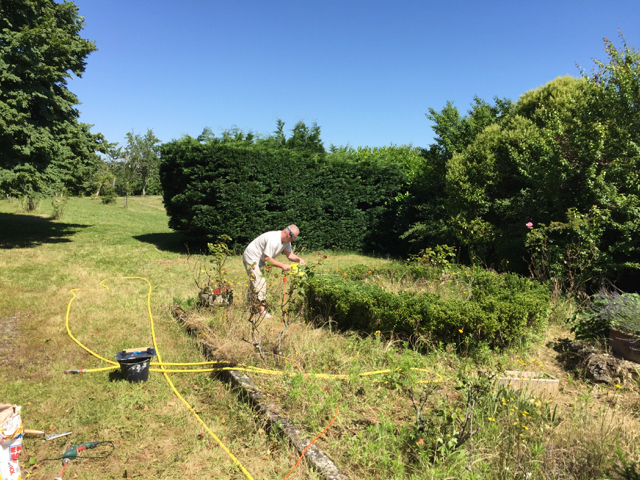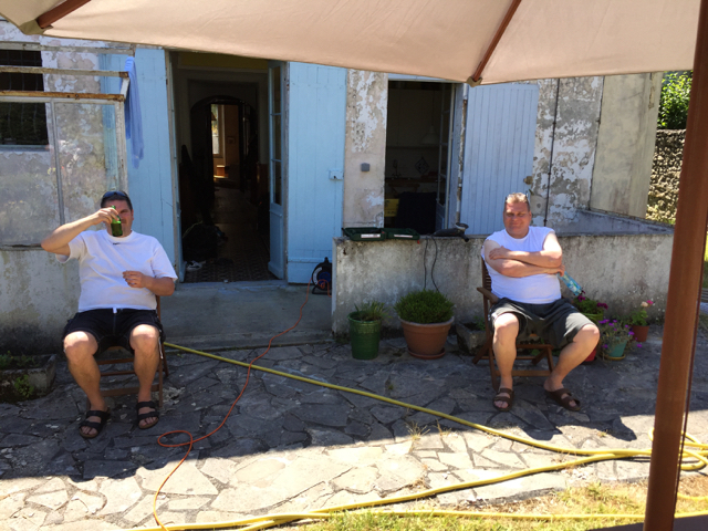 Jocke klippte buxbomshäcken. Under tiden drack bröderna Lundell lite öl.