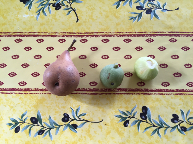 Skördade lite i trädgården idag. Ett päron lossnade när jag rörde vid det så det borde vara moget tänkte jag. Fikonet var ganska mjukt så då är det väl moget. Valnöten var inte riktigt mogen men jag tog den ändå eftersom den kommer ha fallit ner till nästa gång vi kommer hit.