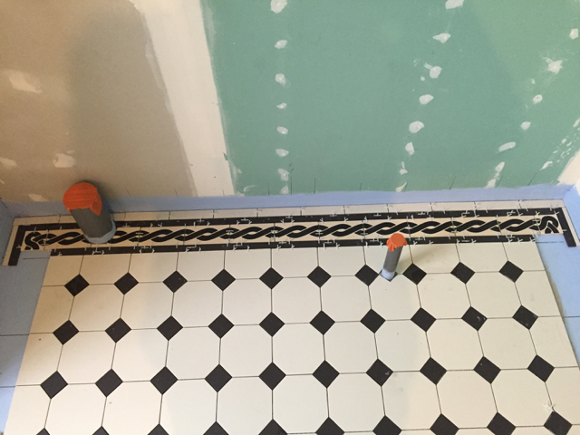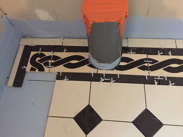 Började med bården på badrumsgolvet. Hann klart ena kortväggen. Tar tid att kapa till bitarna, speciellt vid toa-avloppet. Blev inte speciellt snyggt men förmodligen kommer bara den som städar vid toan se det.