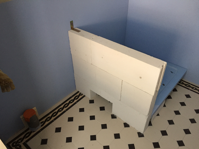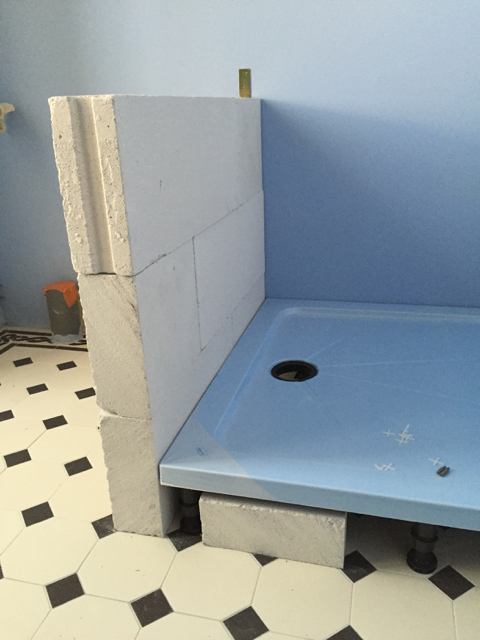 Och lite rester från lättbetongblocken blir en ”vägg” att fästa sockeln i framför duschkaret.