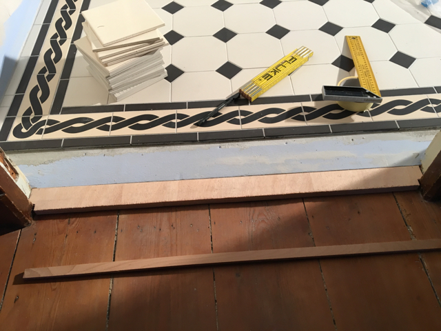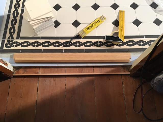 Sedan fixade jag med tröskeln. Först såga till ektröskeln jag köpt i Sverige.