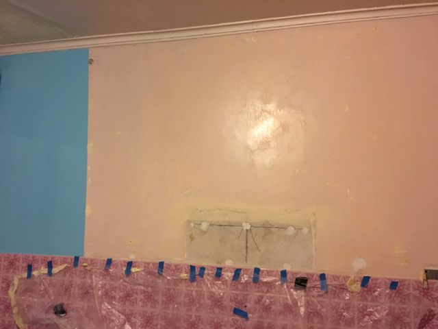 L fortsatte med väggen i badrummet på bottenvåningen. Förberedde för målning genom spackling och slipning.