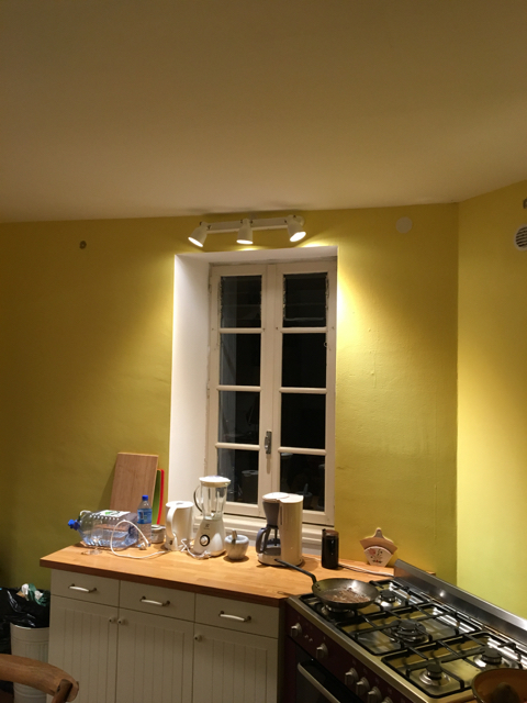 Skruvade upp ny lampa över ena bänken bredvid spisen.