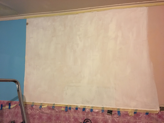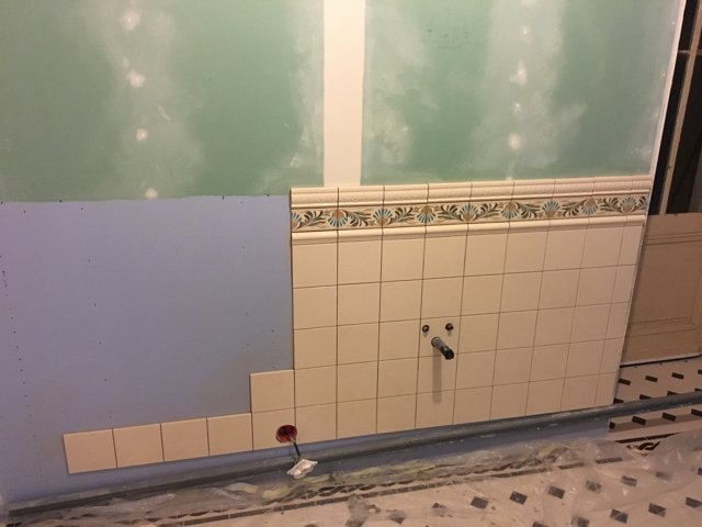 L fortsatte med grundmålning av vägg i badrummet där nere.