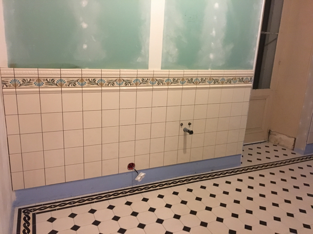 L fortsatte med badrummet där nere och och målade blått på väggen.