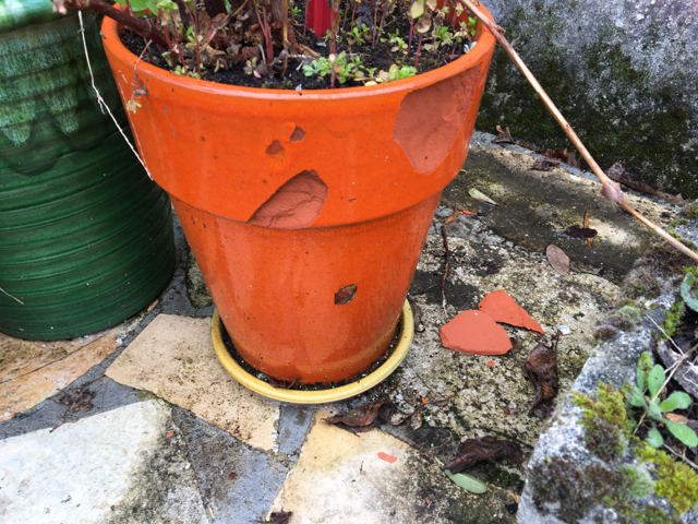 Många krukor som står utomhus har ”sprängts” av kylan. Det var ju rätt ofta minusgrader för ett par veckor sedan.
