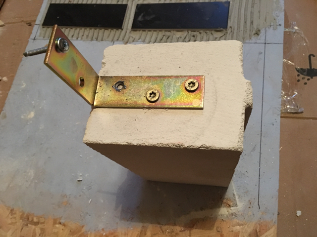 Markerade var de första lättbetongblocken ska sitta på golvet. Testade att skruva fast ett vinkeljärn som ska hålla blocket fast i väggen.