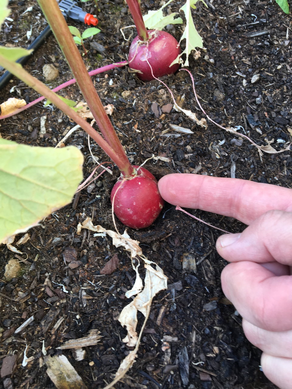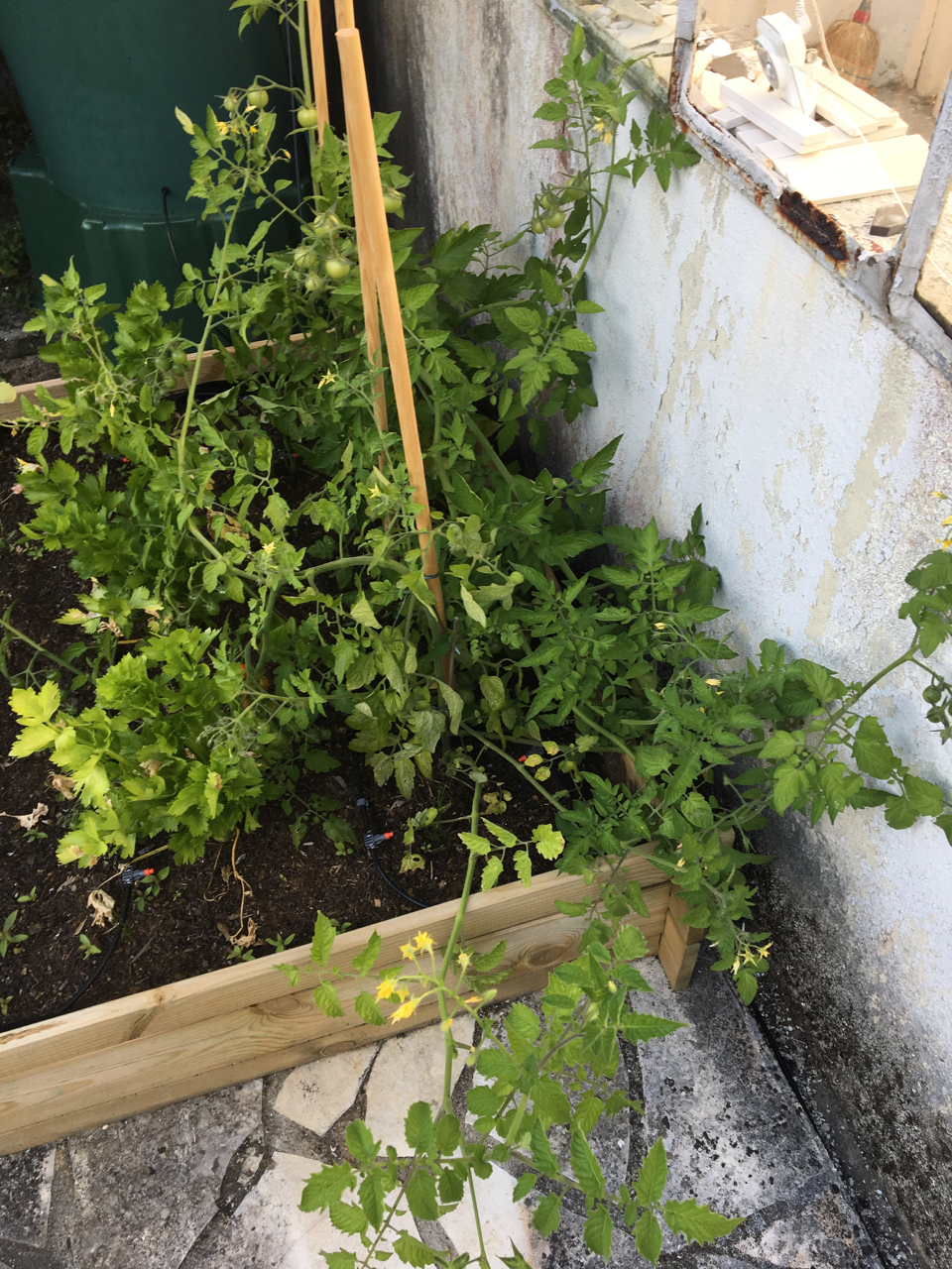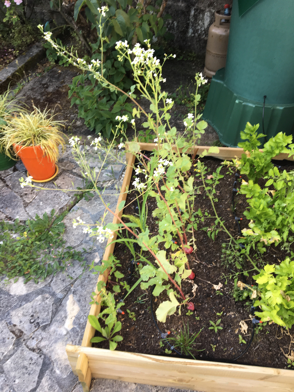 Rädisorna blommar och är gigantiskt stora. Förmodligen träiga. Tomaterna har växt jätte mycket och har ju inget att luta sig mot. Bevattningsanläggningen funkar inte helt bra. Vissa rör kommer det inte ut något vatten från. Får väl kolla om det kommit skräp eller djur i dem.