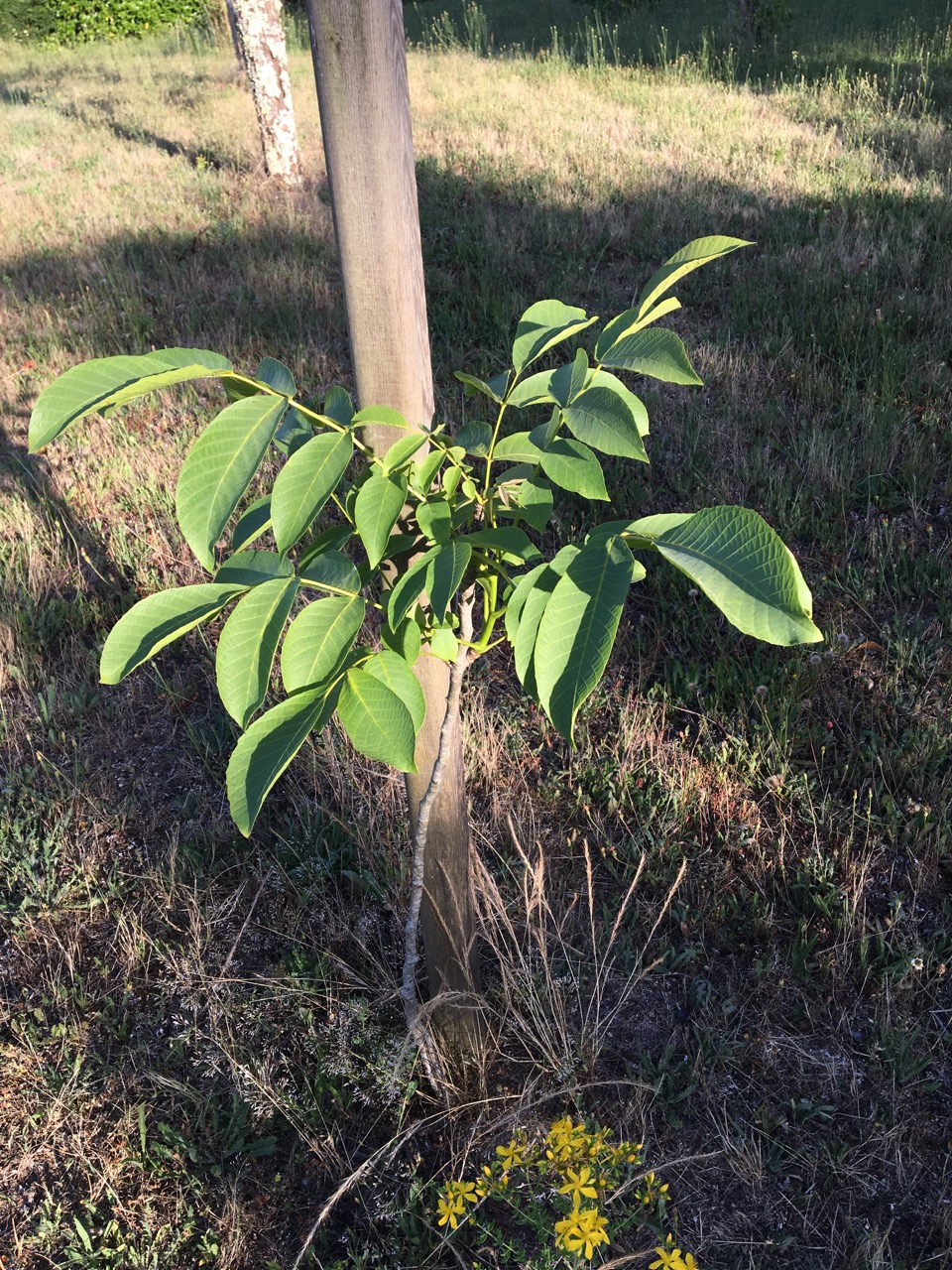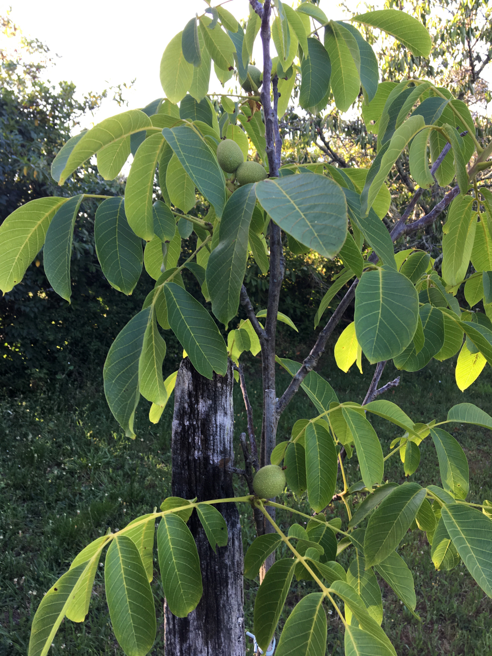Fem valnötter på nya trädet. Det gamla (från gamla ägarens dotter) ser ut att ha tagit sig bra i år men inga valnötter.