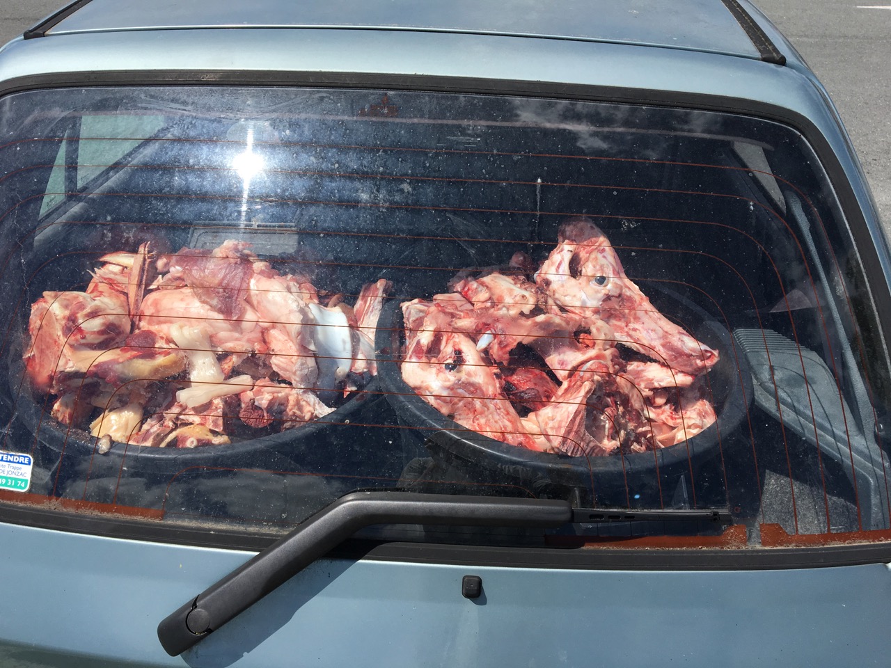 På intermaches parkering låg det lite kött i bakrutan på en bil. Så trevligt då… Hoppas det var kött till ett djur.