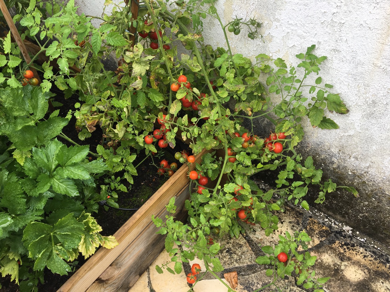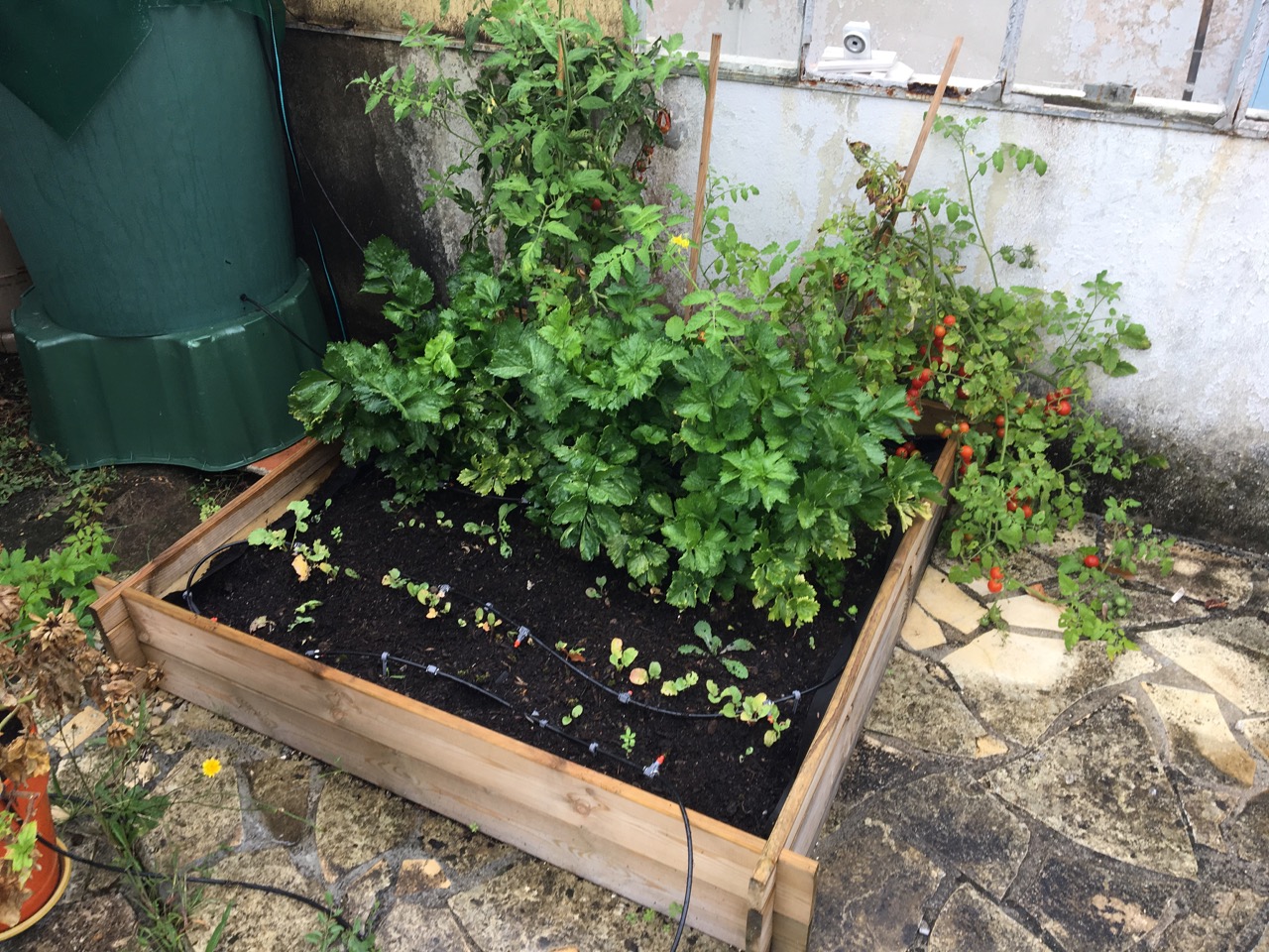 Vildvuxet i vår lilla låda. Körsbärstomaterna är bra, men de vanliga är inte mogna.