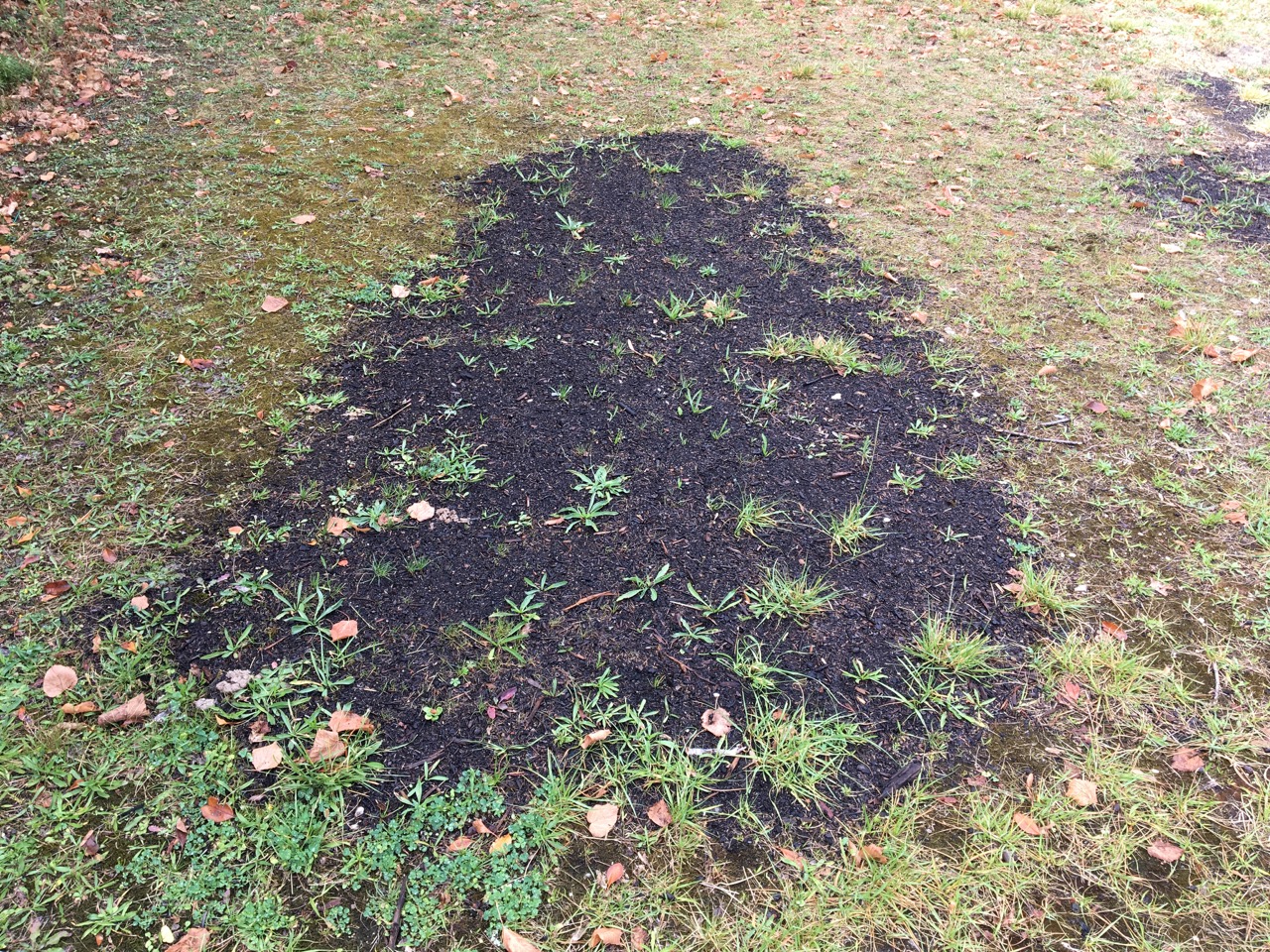 Jag sådde lite nytt gräs på de tre ställena där vi försökte så i somras. Tagit en annan grässort nu, tror den är bättre. Och så har jag ju nästan 2 veckor på mig att övervaka och vattna det hela.