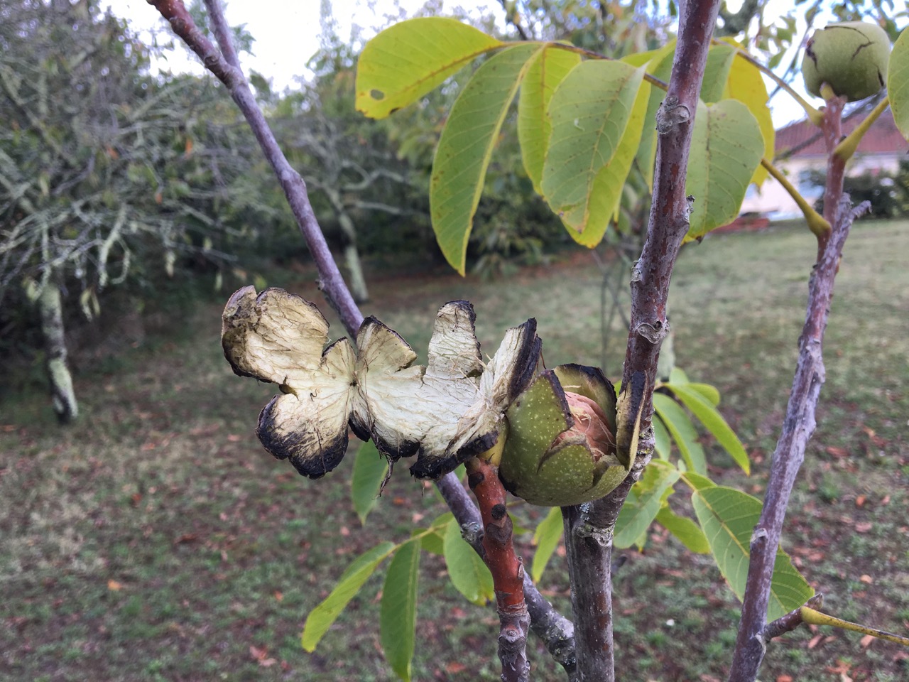 En valnöt hade mognat klart och ramlat ned på marken. Skalet spricker upp helt då.