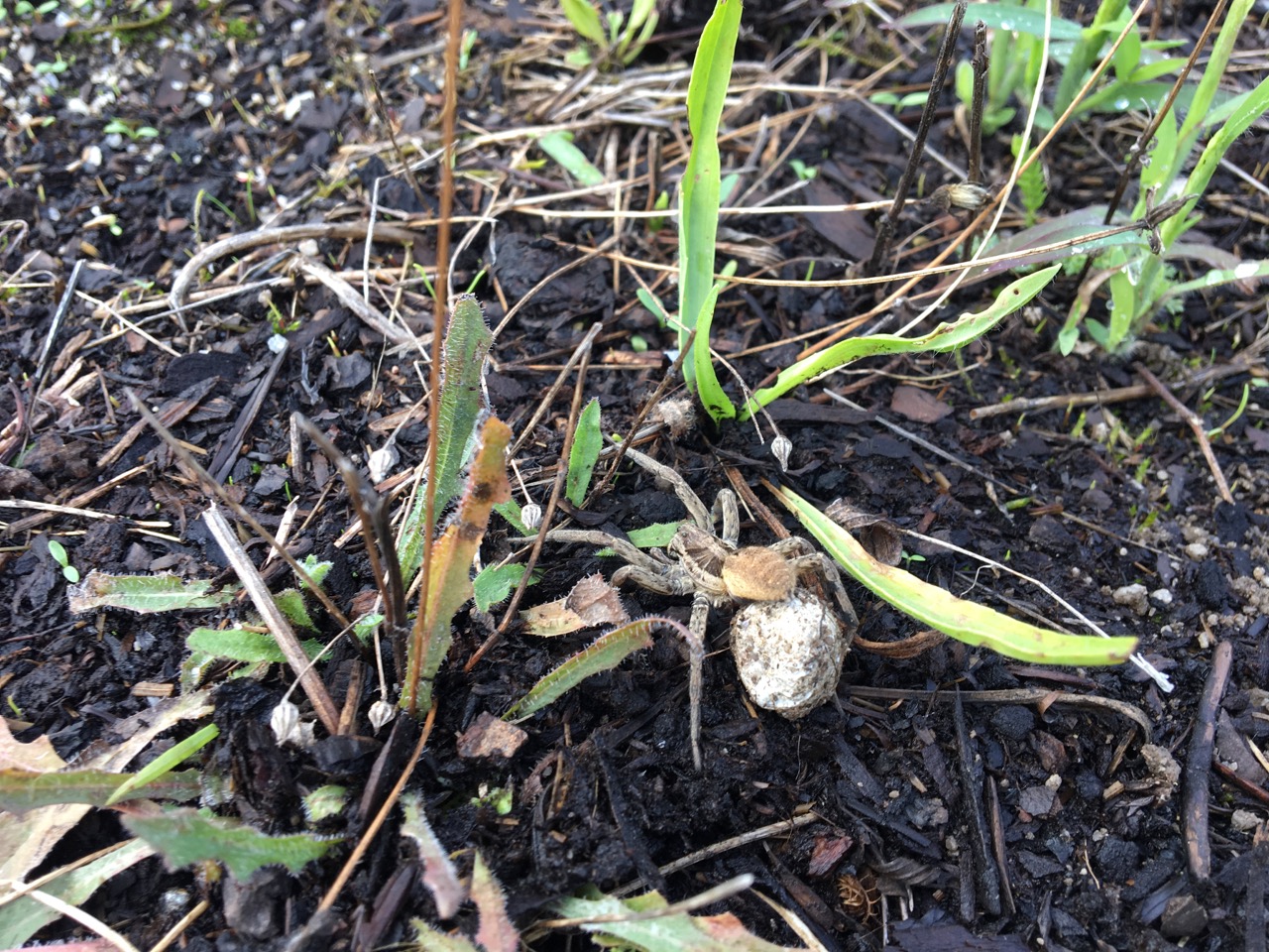 Det var väldigt många stora spindlar som levde i jorden och alla bar på en slags vit kula. Antar att det är ägg eller ungar i den.