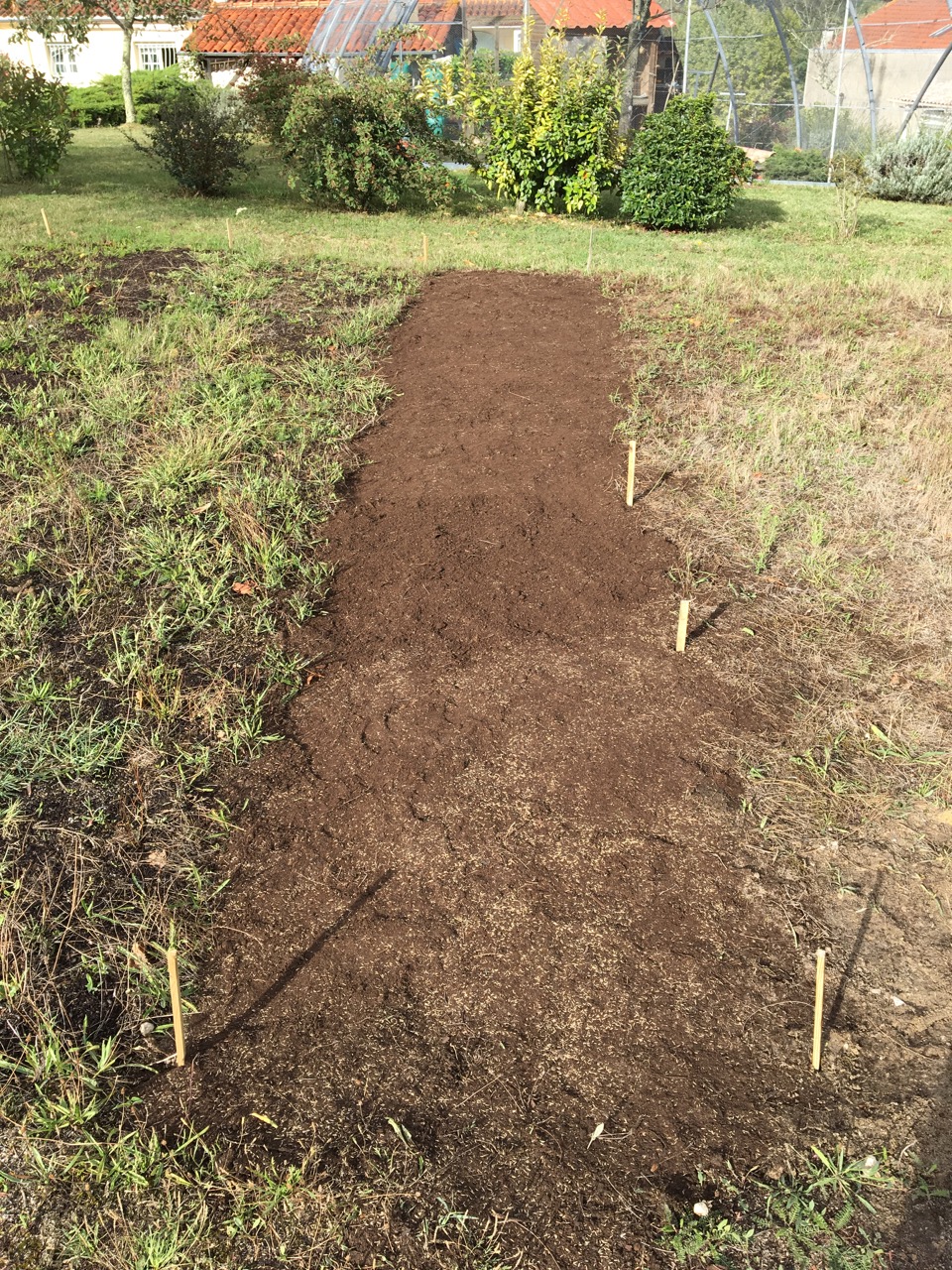 Jag har gjort i ordning ett testområde till för grässådd. Det här området är indelat i tre: gemensamt för alla tre är att jag tog bort allt gammalt ogräs ungefär 10 cm ner. Sedan har ny jord blandats in i alla tre delar. Men de två längst bort har fått mer jord på sig efter grässådden. Och det allra längst bort har jag också packat efteråt genom att gå på det. Delen närmast har jag bara strött ut gräsfröna på utan att lagt på mer jord efteråt.