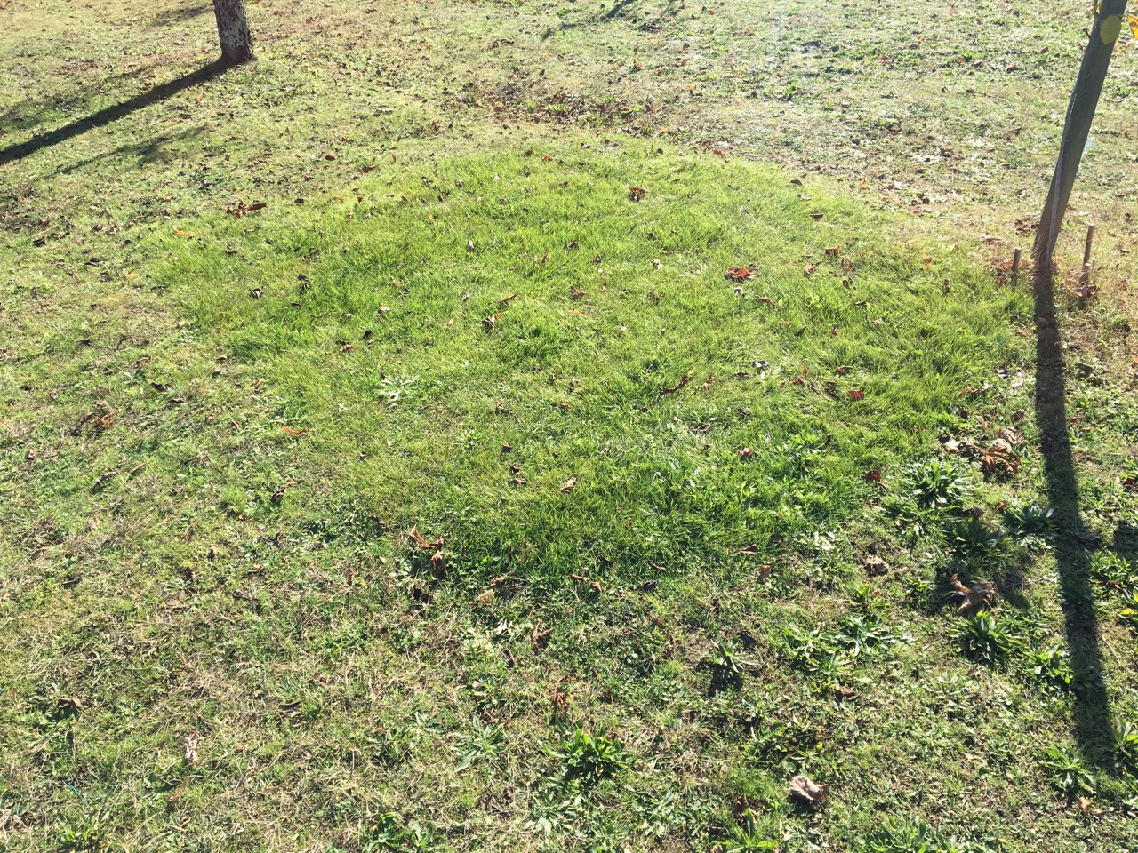 Jag sådde lite nytt vid ena valnötsträdet och där syns det rätt stor skillnad.