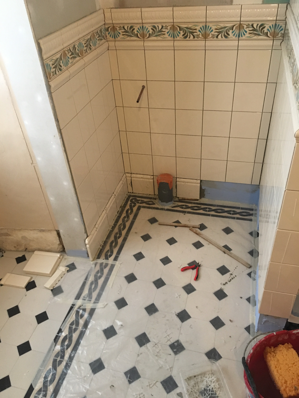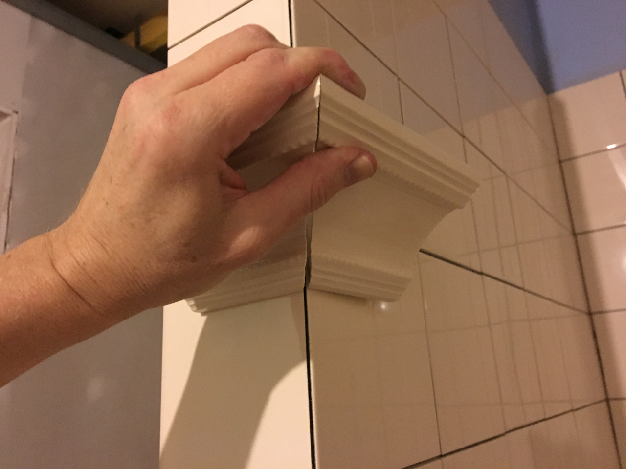 Har handsågat ett antal kakelplattor som utgör kornischen uppe vid taket. De måste geras för invändiga och utvändiga hörn vid duschen. Elektriska kakelkapen var för liten. Tar nästa 30 minuter per platta att såga för hand. Har sågat 4 av 8 nu.