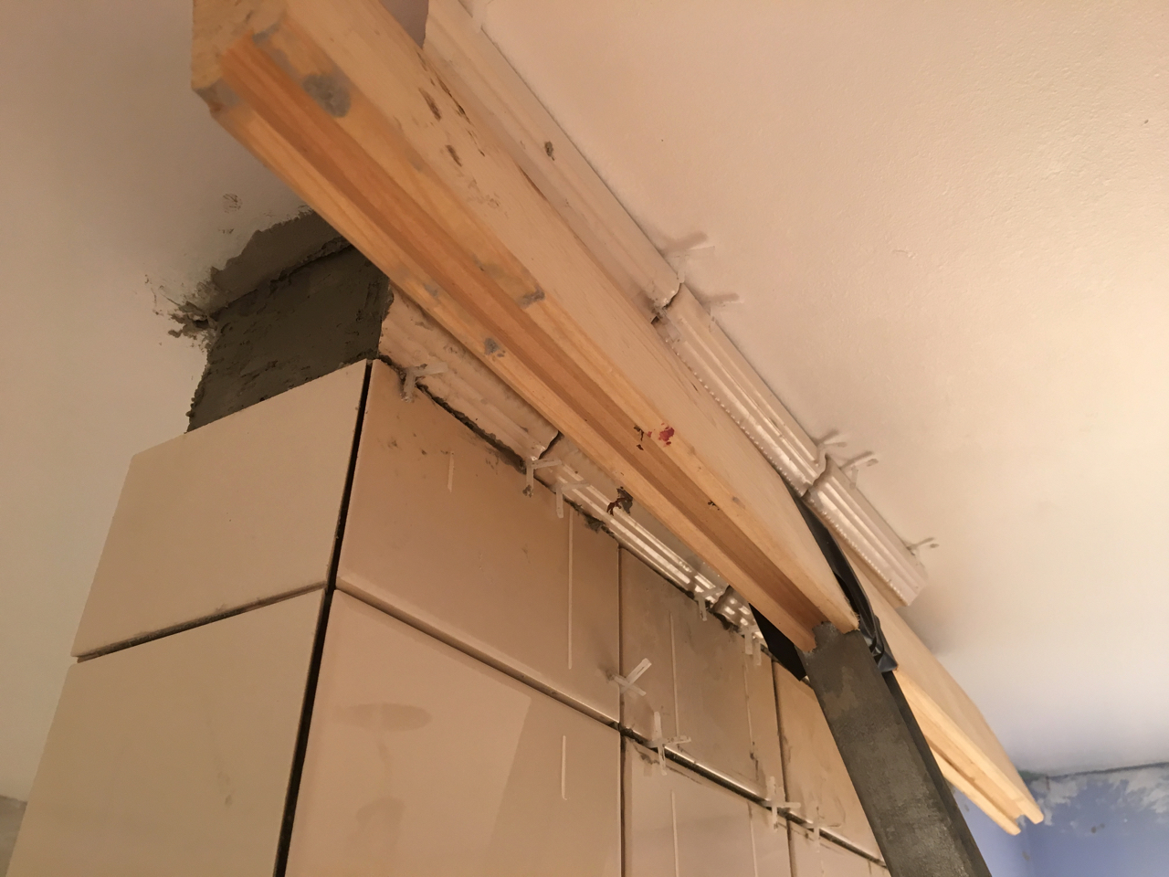 Började försöka kakla översta raderna nu när taket är klart. Gick inte helt bra första försöket för kornischen var för tung trots att jag blandade kakelfixet så kletigt som möjligt. Så jag fick konstruera en stötta som jag använde i ett andra försök. Kommer ta rätt lång tid dock eftersom jag inte kan kakla så många kornischplattor åt gången.