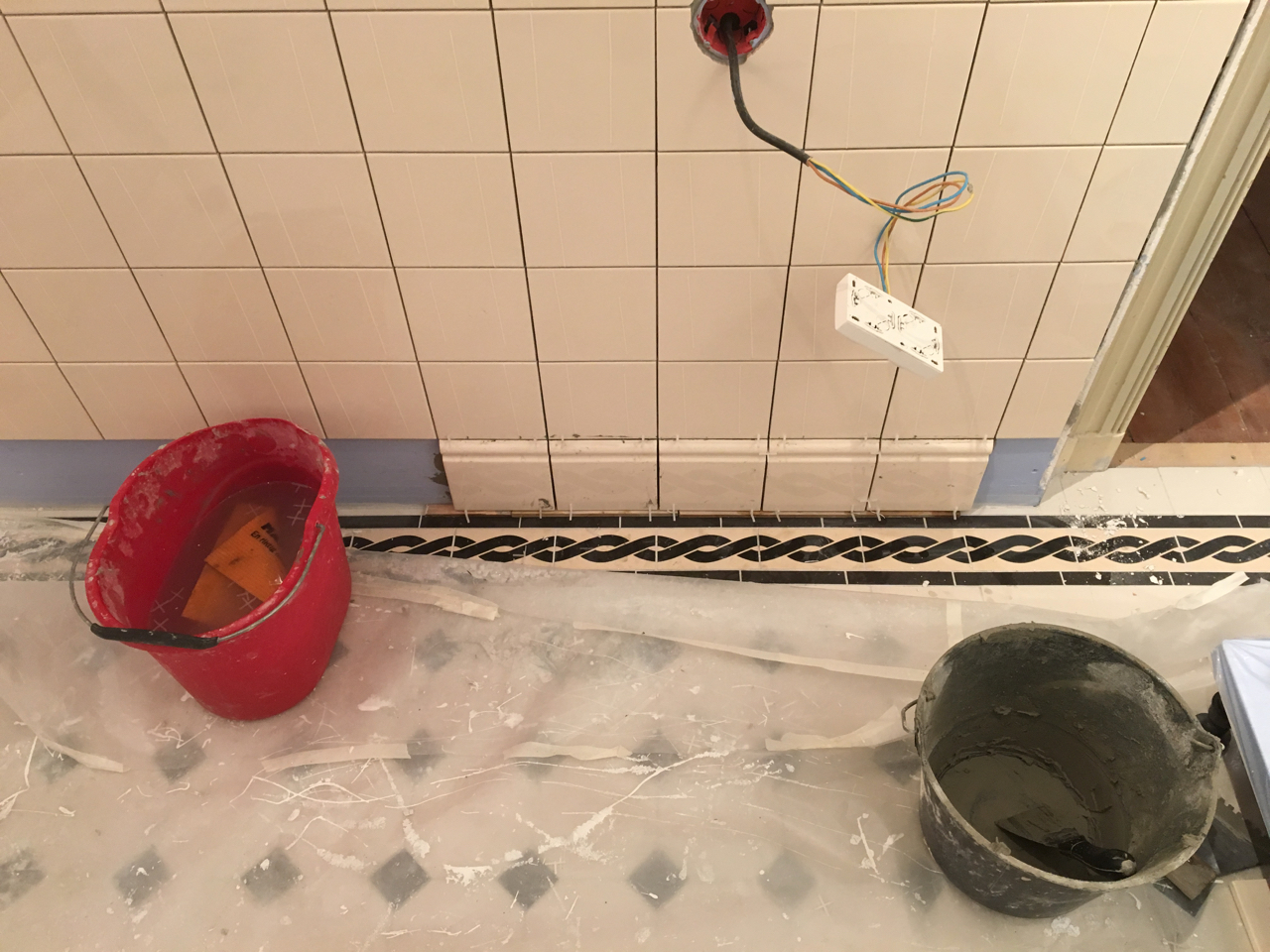 Och i väntan på att det ska torka kaklade jag några sockelplattor på hallväggen.