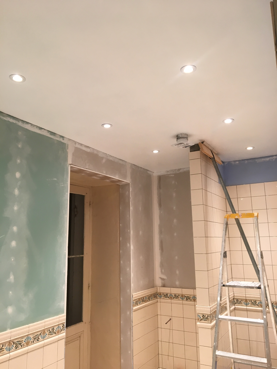 Målade taket i badrummet en ”sista” gång. Jag kommer nog förbättra på några enstaka ställen men lamporna kan jag sätta på plats.