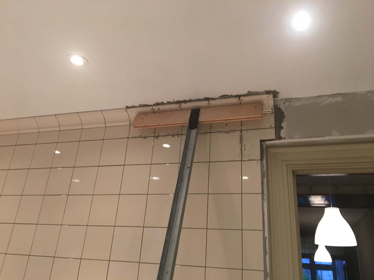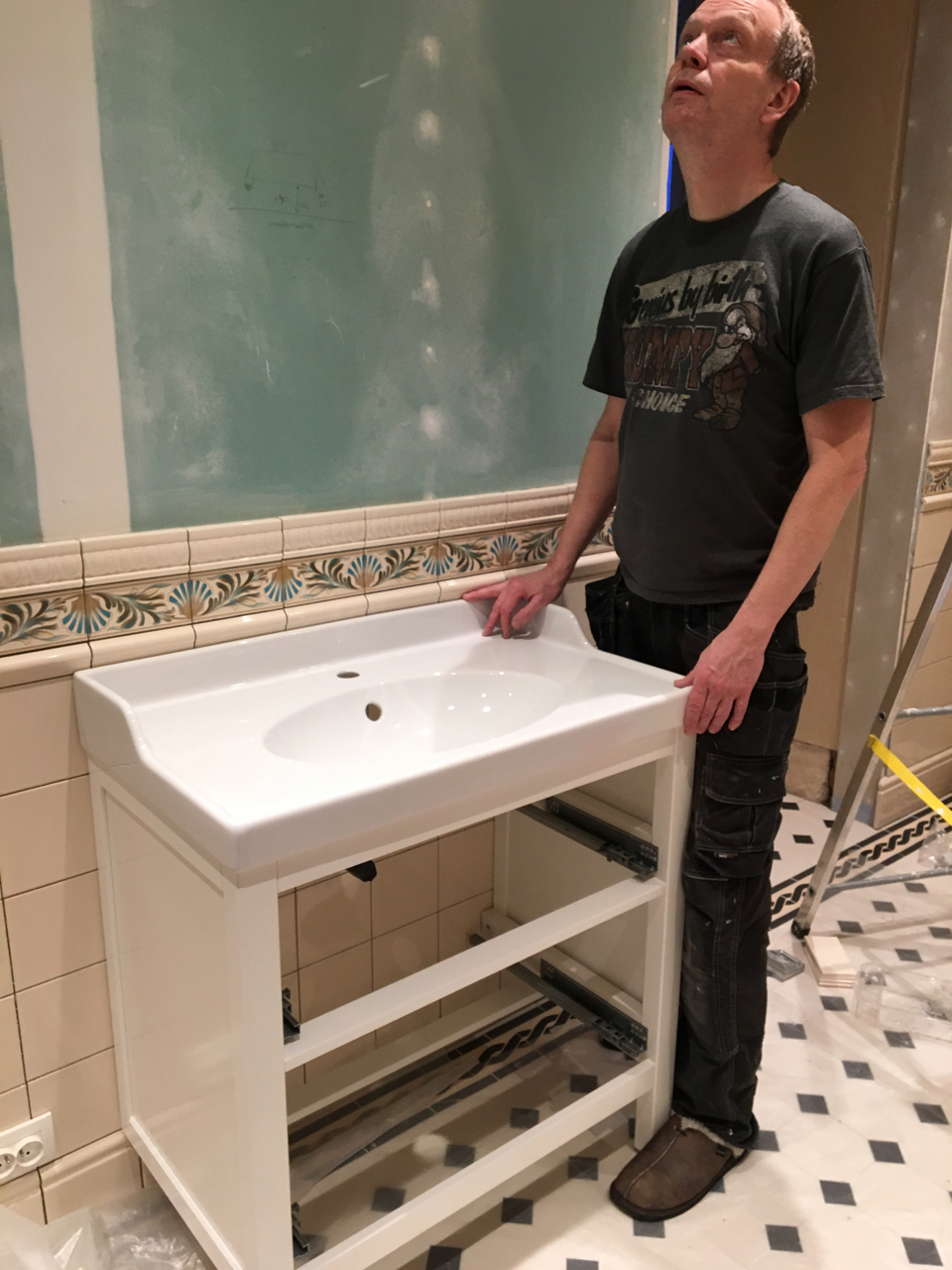 Sedan testade vi med handfatet eftersom jag var orolig att det skulle ”täcka” bården på väggen (som sticker ut en del).